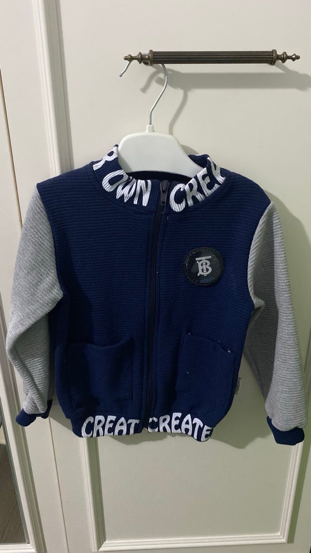Fermuarlı, fitted kesim erkek çocuk hırka, uzun kollu ve triko dokulu. Lacivert ön, gri kollar ve 'CREAT-CREATE' baskılı detaylar içerir. Yumuşak ve sıcak kumaştan üretilmiştir.