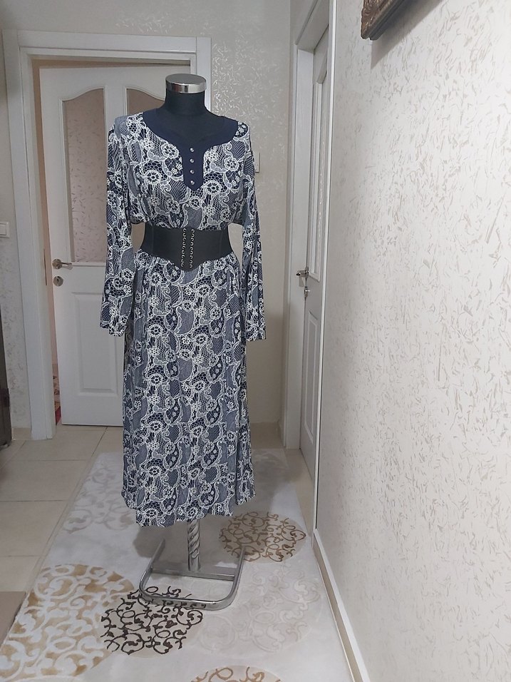 Gri ve Lacivert Tonlarda Tesettür Elbise, hiç kullanılmadı, kemer satılık değildir aksesuar olarak konuldu, kumaşı dökümlü emprime kumaştır.Bir koltuk altından diğerine uzunluğu 52 cm boyu ise 123 cm.dir S/ M beden uyumludur