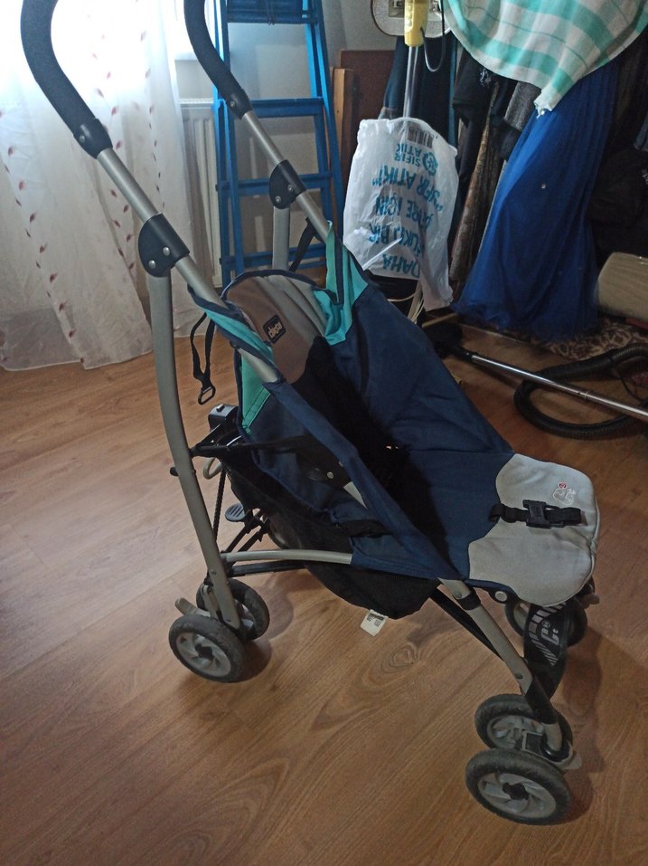 Gri çerçeveli, mavi kumaş oturaklı bebek arabası. Emniyet kemeri ve dört çift tekerleği vardır. Hafif ve katlanabilir yapıda.