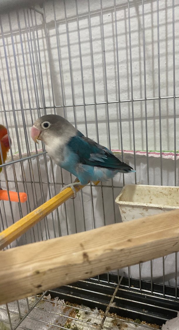 Gri ve mavi tüylere sahip küçük bir muhabbet kuşu, kafeste tahta çubuğa konmuş ve yanında yem kabı bulunuyor.