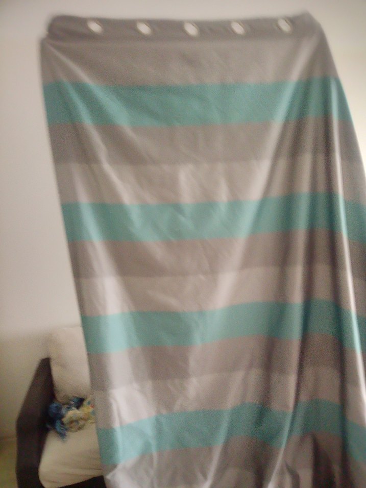 Gri ve mavi tonlarda çizgili, bohem tarzda yumuşak dokulu perde. iki kanat