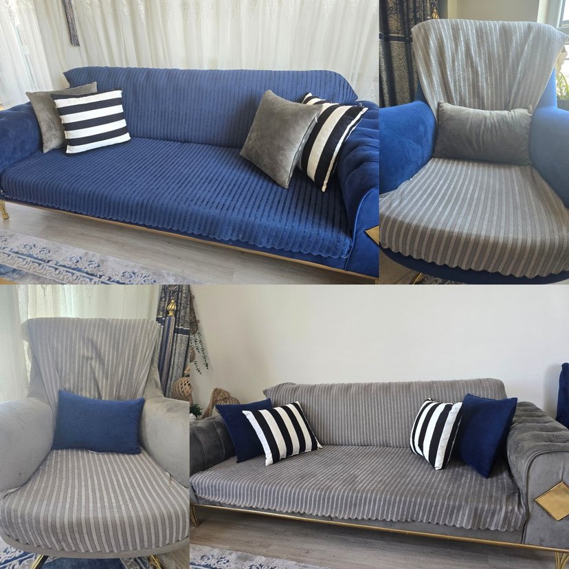 Gri ve mavi renklerde çizgili desenli, modern tarzda koltuk örtüsü. Farklı koltuk tiplerine uyum sağlar. ️altı süngerlidir
