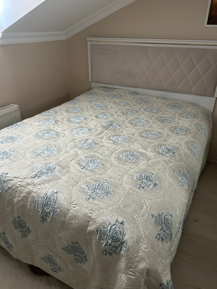 Gri nakışlı çiçek desenleriyle beyaz yatak örtüsü, yatak odasına zarif bir dokunuş katıyor. Yumuşak ve dokulu kumaş rahatlık sağlar. ️Temizdir ve sorunsuzdur. Sadece iki kere kullanıldı.