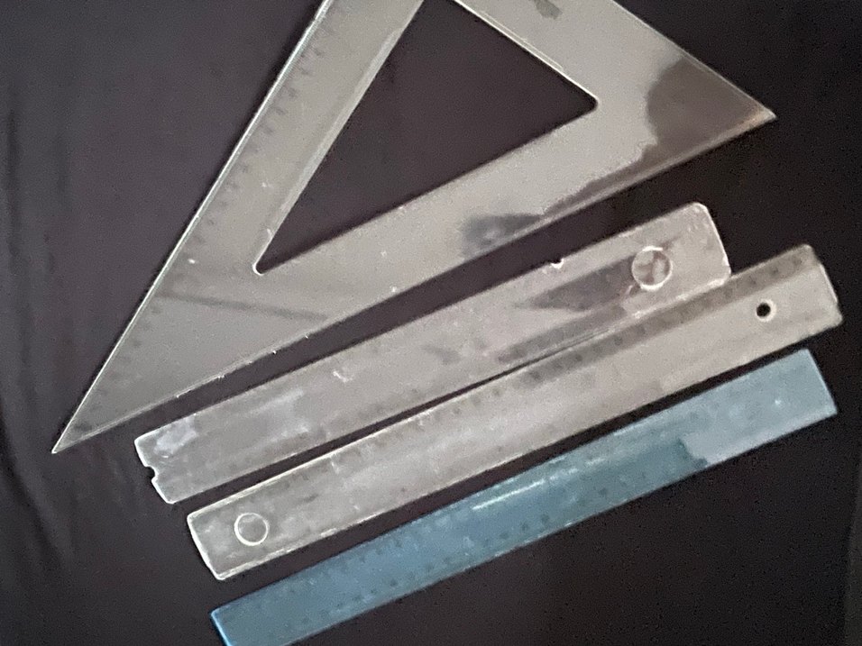 Gri ve mavi renklerde üçgen ve cetvel içeren okul ölçü aletleri seti, hassas çizim ve ölçümler için uygundur.
