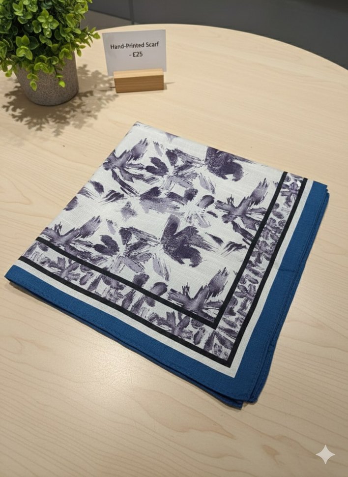 Kadın fular, gri ve mavi tonlarda el baskılı desen ve pilili detaylara sahiptir. Yumuşak sentetik kumaştan yapılmış, çağdaş Paris tarzını yansıtır.