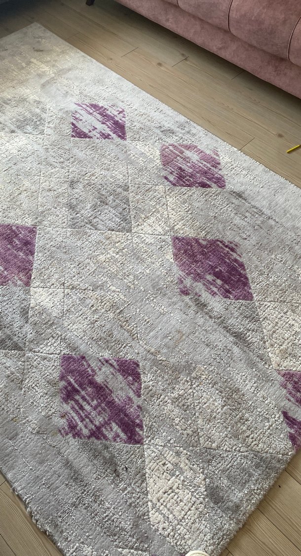 Gri ve mor kareli desenli, modern tarzda bir halıdır. Odaya hafif renkli bir dokunuş katar. İki parça halıdır 3+3 toplam 6 metre kare tekliflere açığım