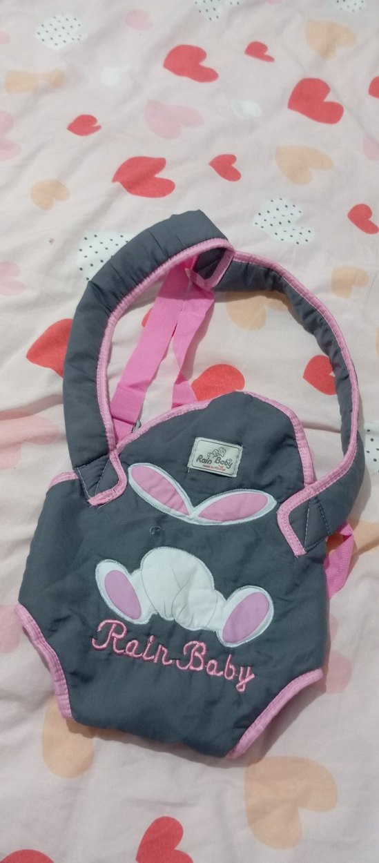RainBaby marka gri ve pembe bebek taşıyıcı, yumuşak dolgulu ve ayarlanabilir askılıdır. Önünde sevimli tavşan işlemeli detay bulunur.