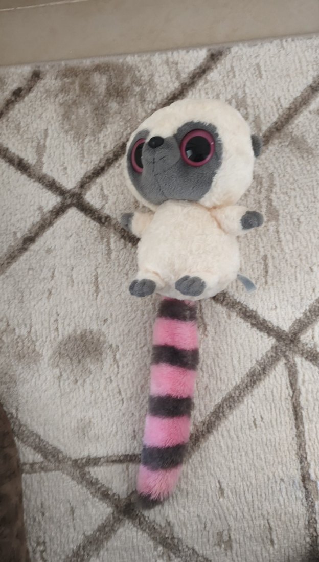 Bu peluş oyuncak, gri ve beyaz gövdeye, büyük gözlere ve pembe-gri çizgili uzun kuyruğa sahiptir. Yumuşak ve kabarık dokuludur.