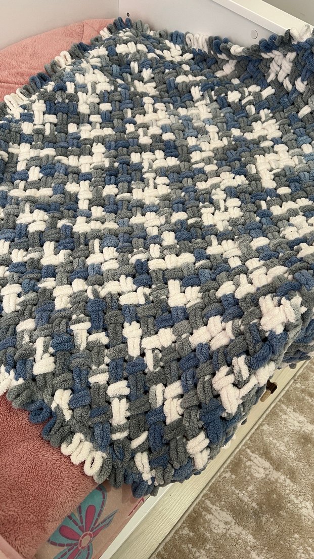 Yumuşak ve rahat dokulu gri ve mavili ve pembe ve beyazlı çocuk battaniyesi, sıcaklık ve konfor için ideal. Adet fiyatı 700