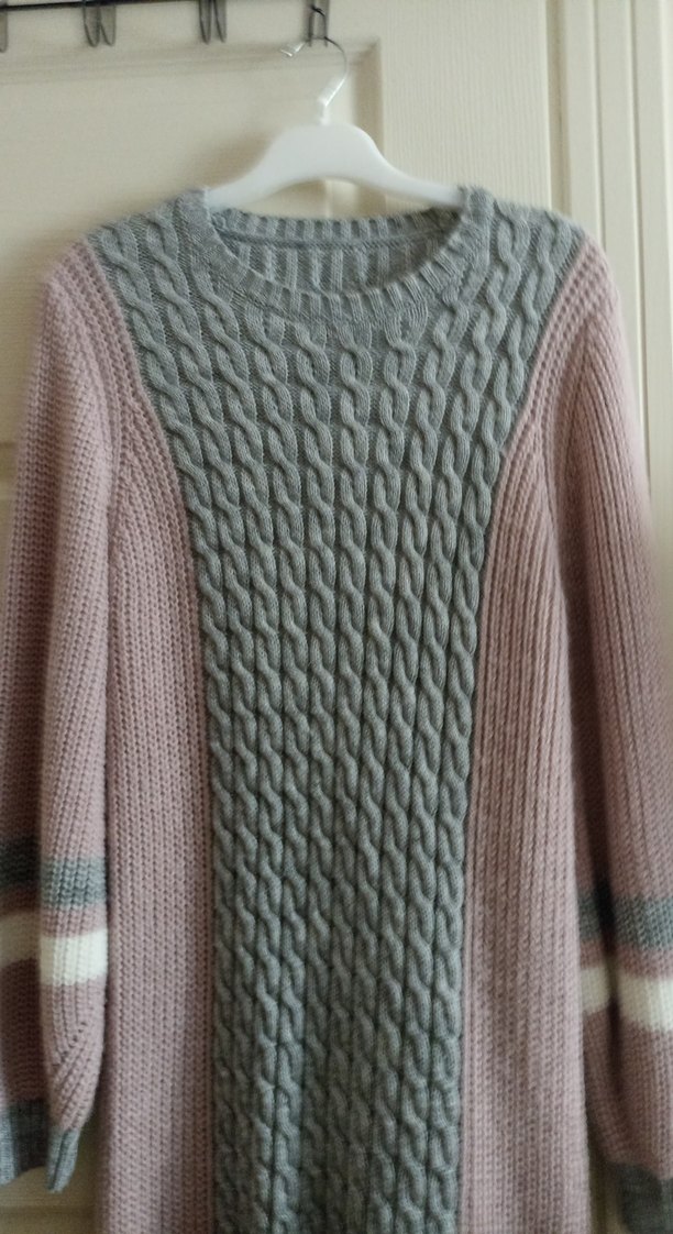 Bu kadın kazak, yuvarlak yaka ve uzun kollu örgü tasarımıyla gri ve pembe renkleri bir araya getirir. Rahat kesimli ve günlük kullanıma uygundur.