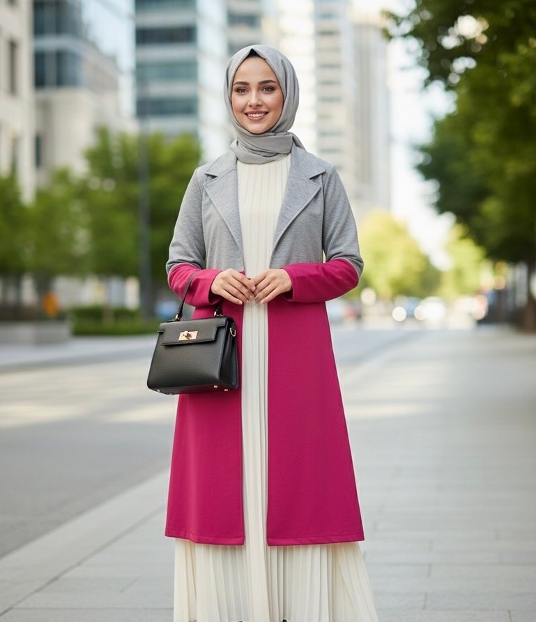 Gri ve Pembe Renkli Kadın Uzun Ceket