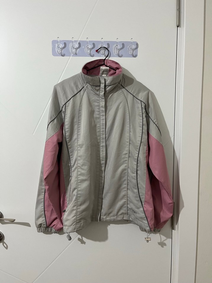 Gri ve pembe renklerde, yüksek yakalı ve uzun kollu, fermuarlı, midi uzunlukta, bol kesim kadın spor montu. Boy 59cm göğüs 104cm bel 100cm kol 70cm