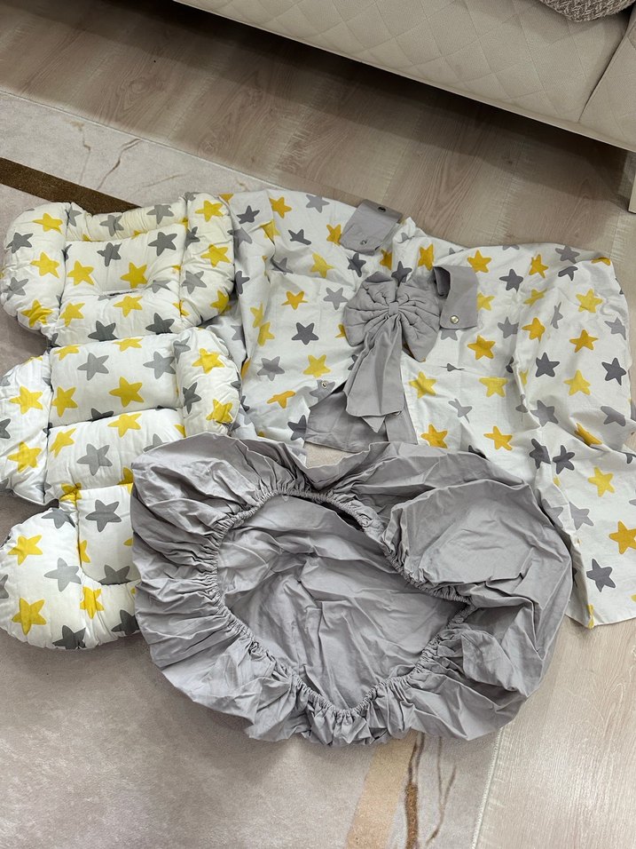 Gri ve sarı yıldız desenli, yumuşak sentetik kumaştan yapılmış çocuk uyku seti, çeşitli dolgulu aksesuarlar içerir. Hiç bir sorunu yok görseldekilerin hepsi gönderilecektir #puset #örtü #yastık
