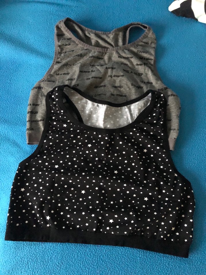 Gri yazılı ve siyah yıldız desenli, rahat kesim ve midi uzunlukta iki spor büstiyer. ️ 13 14 y aş♀️