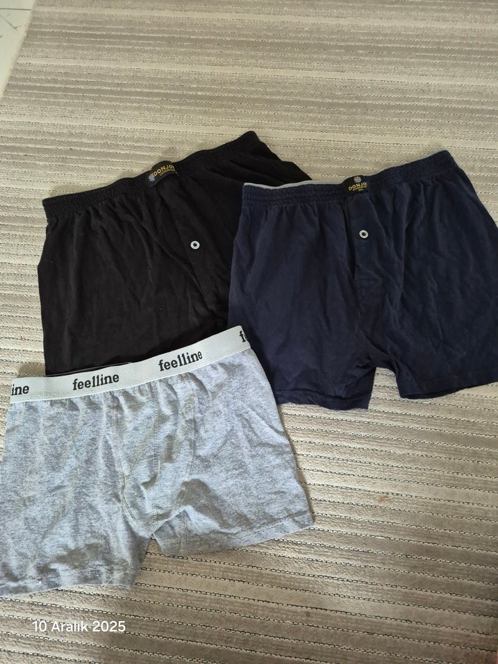 Gri, lacivert ve siyah renklerde, bol kesim ve midi boyda üçlü erkek boxer seti. ürünler sıfır Hiç kullanılmadı sadece makinede yıkandı üzerinde yazan bedenden küçük olduğu için kullanılmadı ölçülere bakıp alın XL yazıyor ama m beden L beden uyumlu