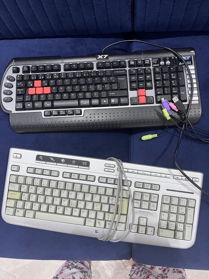 Gri ve koyu gri renklerde, standart düzenli iki kablolu klavye, oyun veya kısayollar için renkli tuşlar içerir .