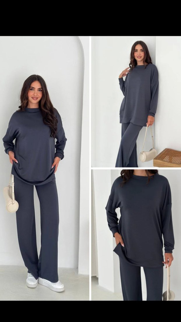 Gri renkte, uzun kollu, yuvarlak yaka ve oversize kesim kadın eşofman takımı. Yumuşak ve sıcak kumaştan, günlük kullanıma uygun şık bir parça.