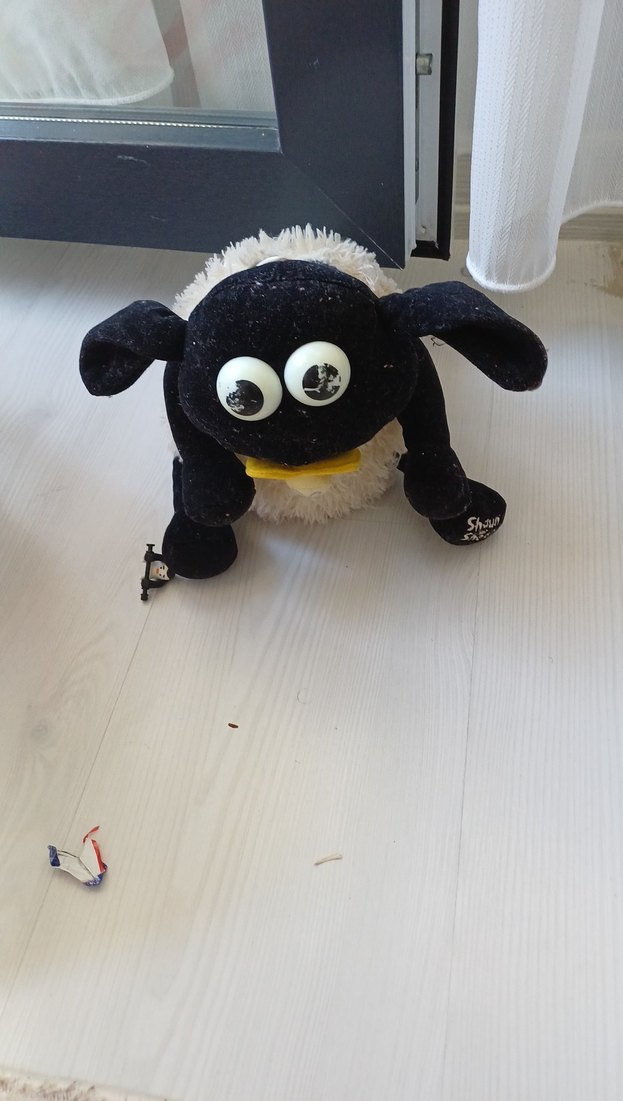 Yumuşak gri ve siyah peluş gövdesi, büyük ifadeli gözleri olan oyuncak koyun. Kabarcık dokusu ile rahat bir arkadaşlık sağlar.