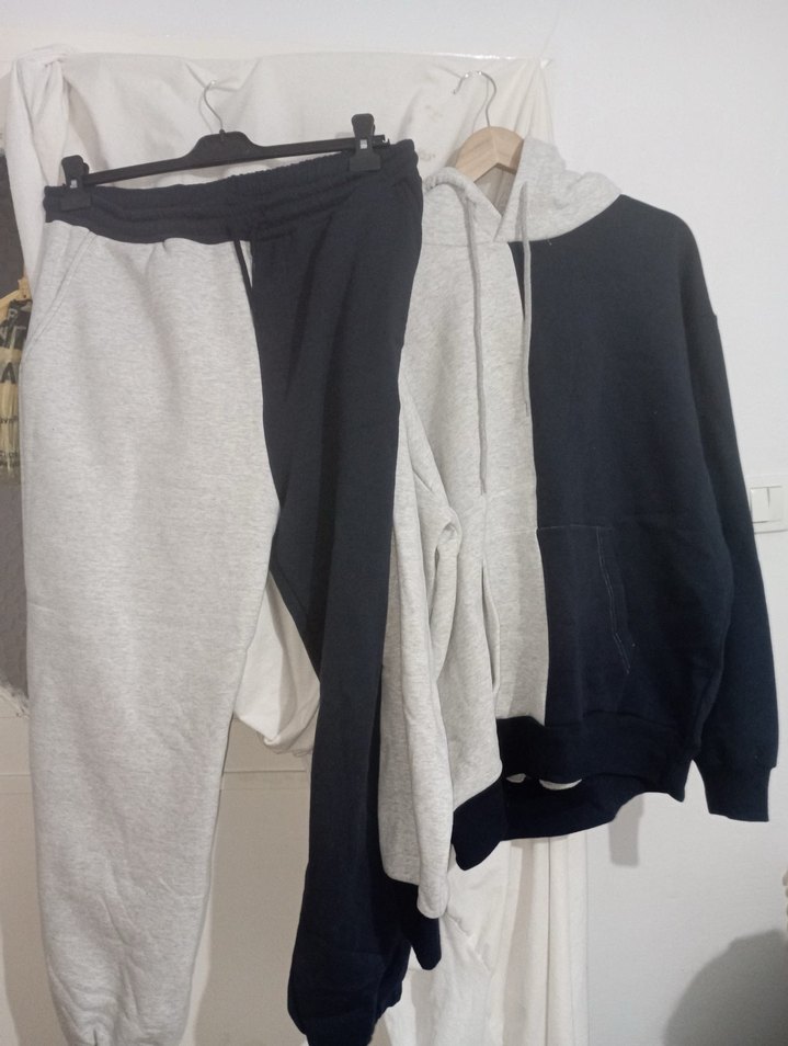 Gri ve siyah renk bloklu, pamuklu kumaştan yapılmış bol kesim kız eşofman takımı. Uzun kollu, yuvarlak yakalı üst ve eşofman altından oluşur.