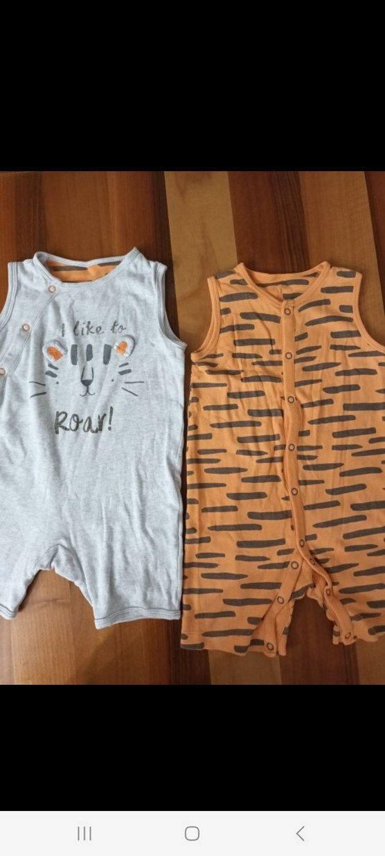 Gri ve turuncu renklerde, baskılı desenli kolsuz bebek tulumları. Yumuşak pamuklu örgü kumaştan, çıtçıt düğmeli ve eğlenceli desenlere sahip.