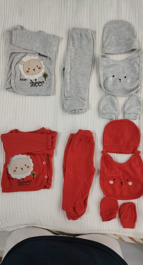 Bu erkek bebek takımı, yumuşak, triko ve polar kumaştan yapılmıştır. Üzerinde işlenmiş koyun desenleri bulunur, uzun kollu ve bisiklet yaka olarak tasarlanmıştır.