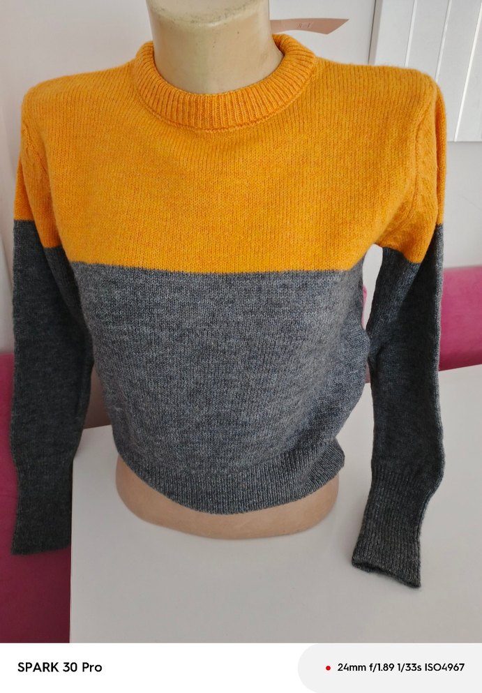 Fitted kesim, yuvarlak yakalı, uzun kollu kadın kazak. Gri ve turuncu renk bloklu, kısa boy, örme kumaştan rahat ve sade tarzda.