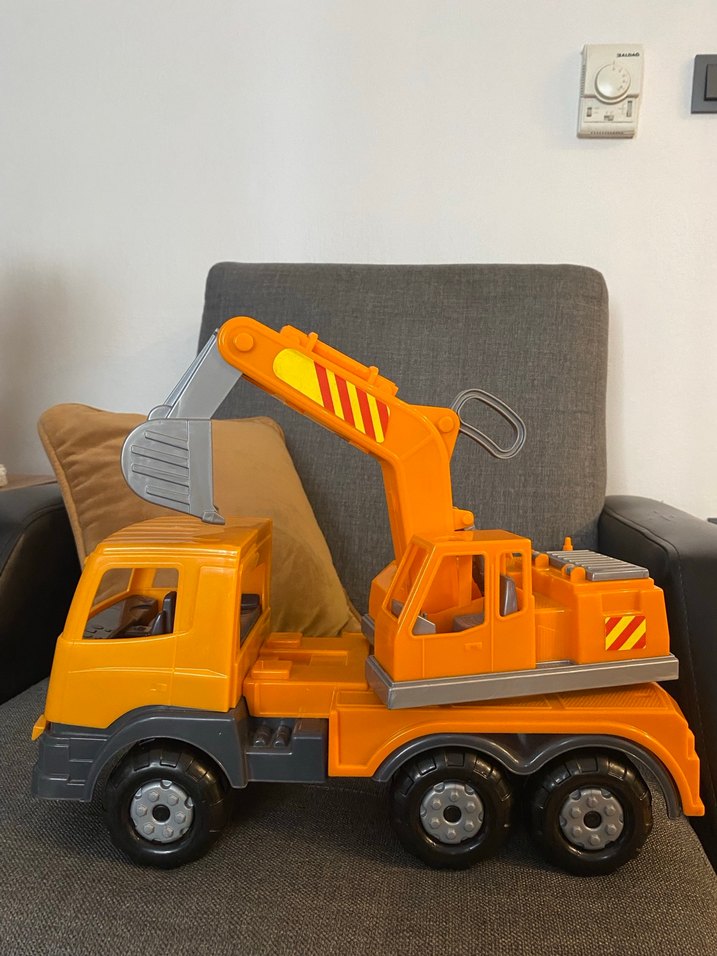 Gri ve canlı turuncu renkte, hareketli kepçe kolu ve kovası olan oyuncak kamyon. Altı tekerlekli ve detaylı kabin yapısına sahip.