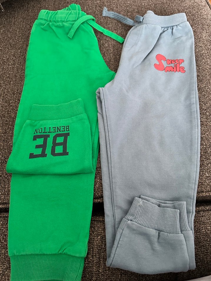 Gri ve yeşil renkte, yumuşak kumaştan yapılmış bol kesim erkek çocuk eşofmanları. Gri modelde 'Keep Smile' baskısı, yeşilde 'BE BENETTON' baskısı bulunur. Bel ve bilek kısmı lastiklidir. 4-5 yaş