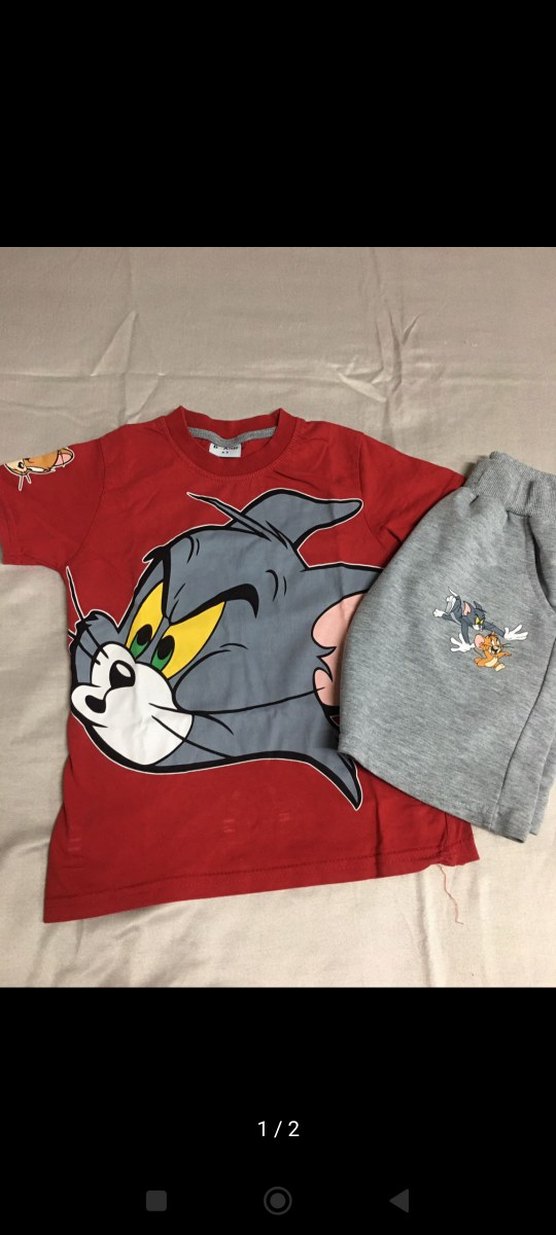 Kırmızı üstte büyük Tom ve Jerry baskısı, gri pantolonda küçük baskı ve kolay kullanım için velcro detaylı kedi kıyafeti.