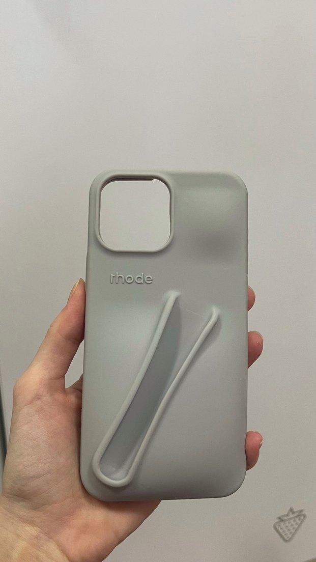 Gri renkli bu telefon kılıfı, kolay tutuş için velcro kayışa ve üzerinde 'thode' yazısına sahiptir. Sade normcore tasarım.