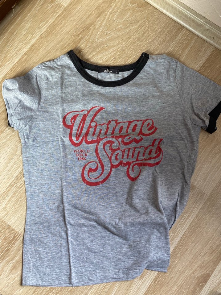 Gri pamuklu, kısa kollu ve yuvarlak yakalı bol kesim tişört, kırmızı vintage baskı ve "TOUR" yazısıyla rock punk havası yaratır.