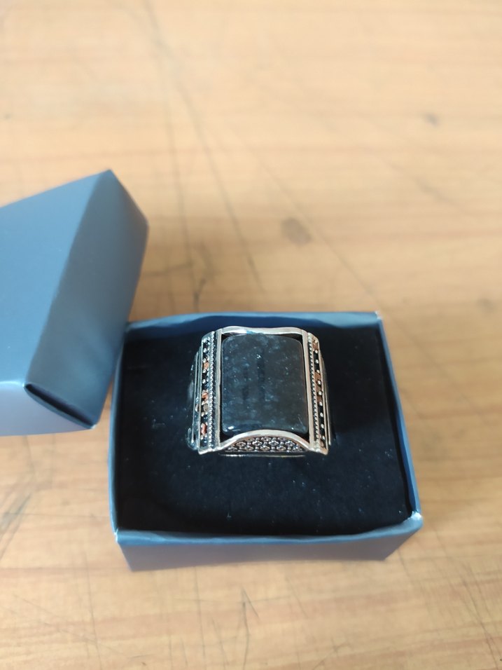Gri renkte, vintage esintili bohem tarzında erkek yüzüğü. Kalın dikdörtgen taş ve detaylı yan süslemelere sahiptir.