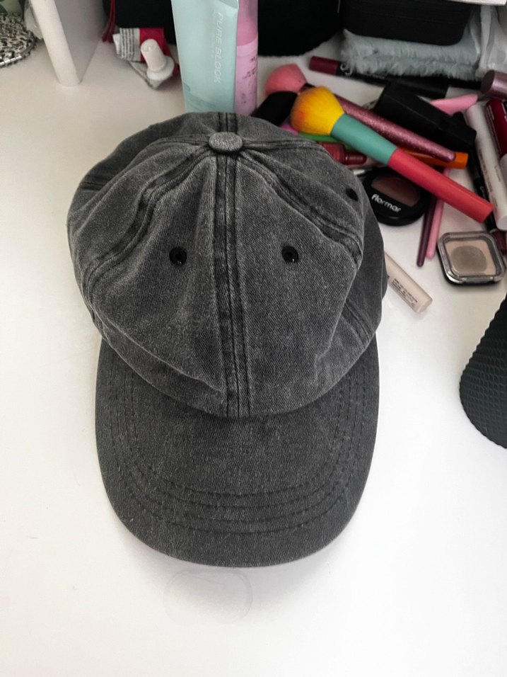 Gri denim kumaştan, grunge punk etkili, rahat ve şık kadın şapkası.