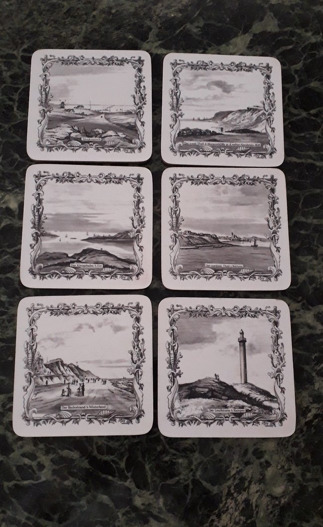 Altı adet gri vintage tarzda, deniz ve deniz feneri çizimleri bulunan bardak altlığı seti.