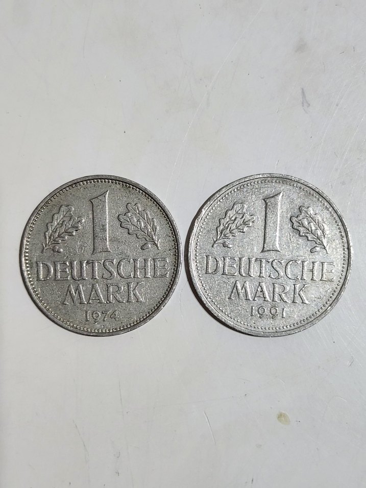 1974 ve 1991 tarihli, kabartmalı yazı ve meşe yaprağı desenli, 1 Deutsche Mark görünümlü gri vintage rozetler.