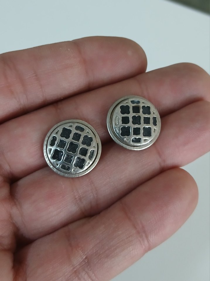 Gri renkte, kare desenli yuvarlak vintage erkek küpeleri, karşı kültür tarzını yansıtıyor.