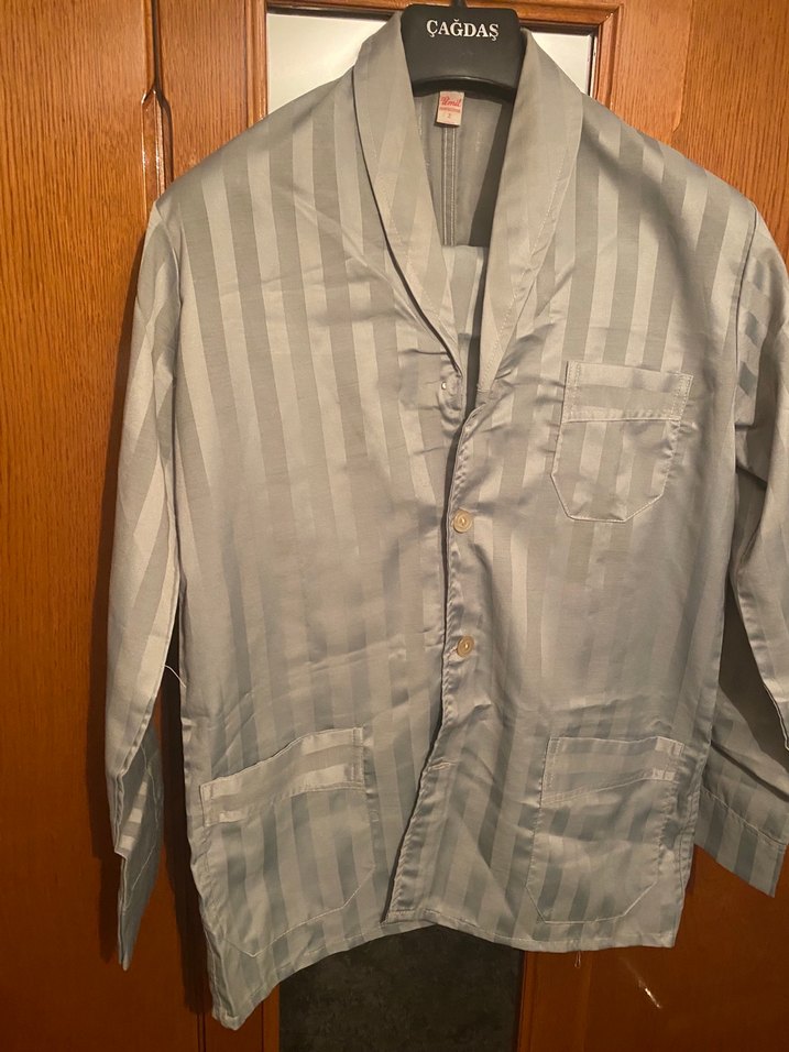 Gri renkli, düğmeli vintage erkek pijama takımıdır. Uzun kollu, normal kesim ve midi boydadır. Notched lapel yakaya sahiptir. Kullanılmadığı için lastik deforma oldu