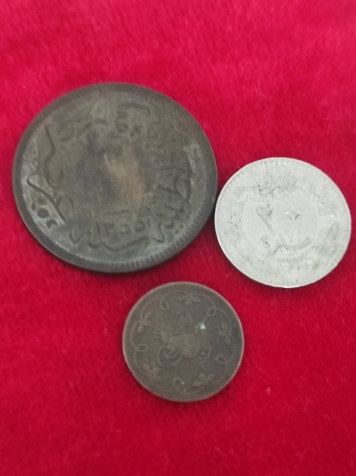 Farklı gri tonlarında, yaşanmışlık izleri taşıyan üç vintage erkek rozet seti, klasik tasarımlı. ️ 3adet Osmanlı madeni para