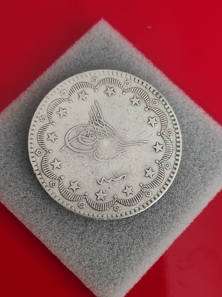 Yıldız desenleri ve klasik amblem tasarımıyla gri tonlarda vintage tarz erkek rozeti. Mütevazı ve geleneksel görünüme sahiptir. ⭐V MURAT Gümüş nadir basim 20 kuruş