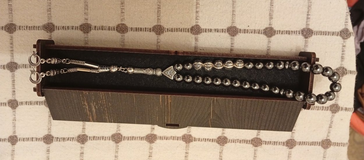 Gri boncuklar ve detaylı gümüş aksanlarla vintage tarzda erkek tesbih, ahşap kutuda sunulmuştur. ️