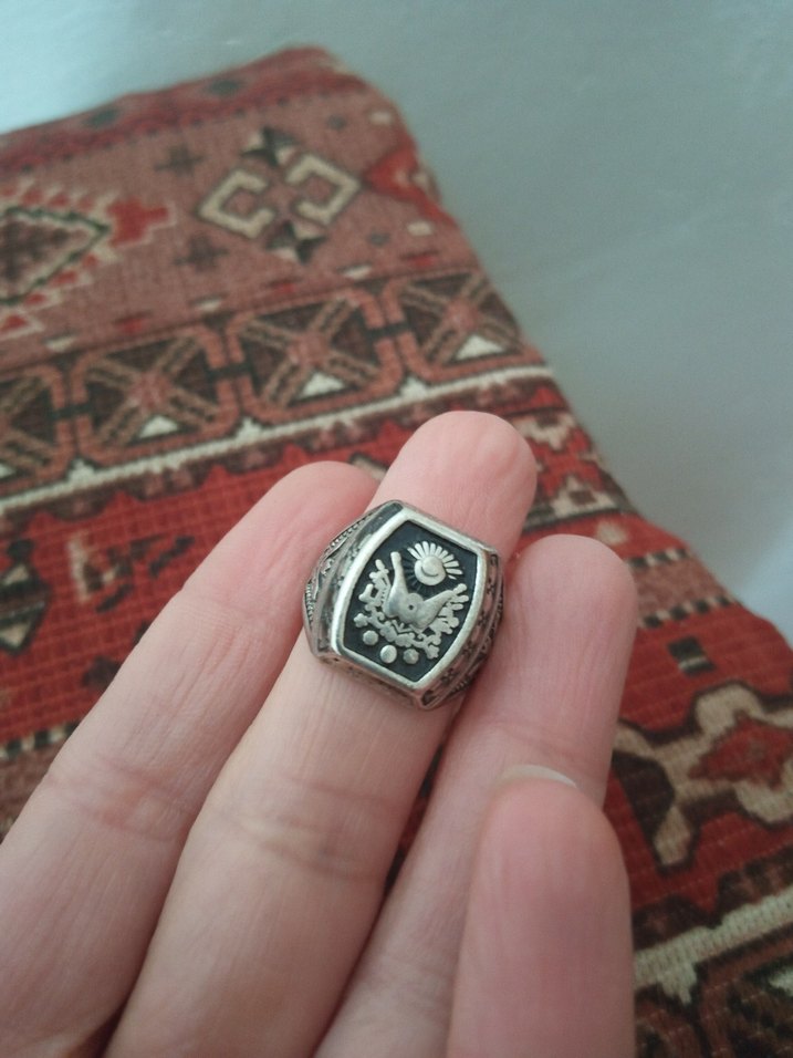 Bu erkek yüzüğü, gri vintage tasarımı ve detaylı işlemeleriyle, karşı kültür tarzını yansıtan bir amblem taşır. ️