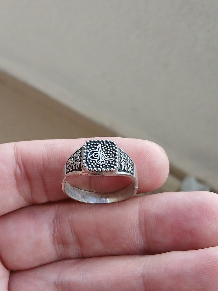 Gri renkte, vintage desenli, sade ve klasik tarza uygun erkek yüzüğü.