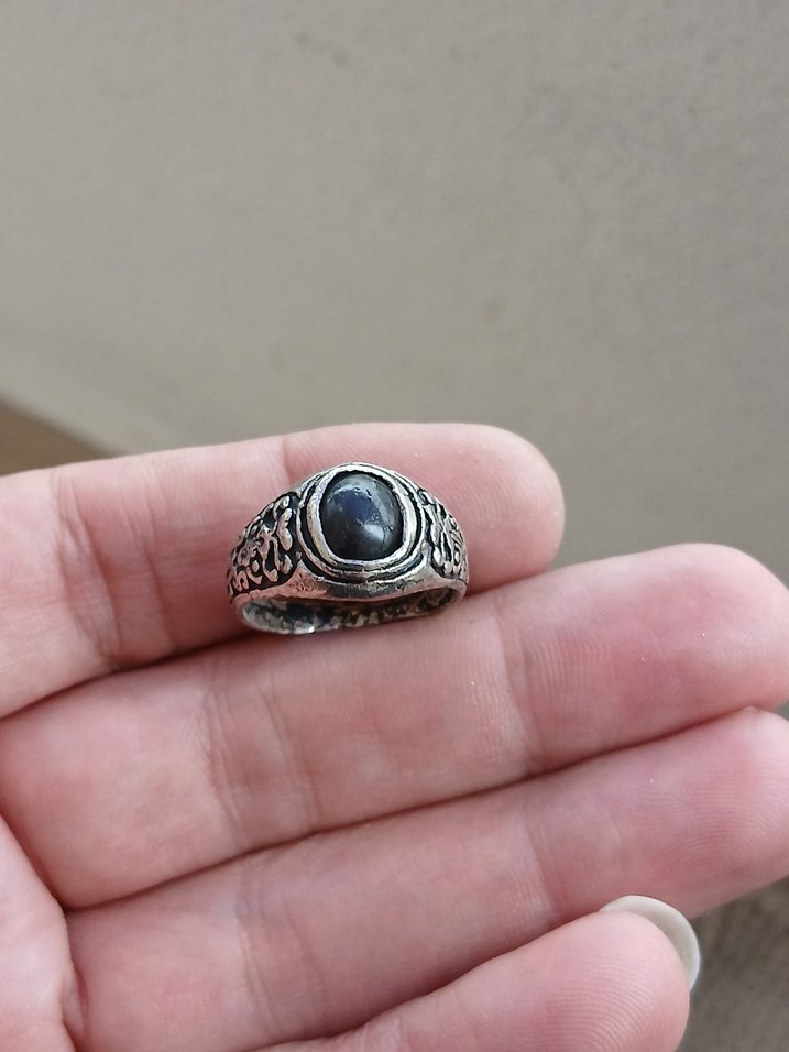 Bu erkek yüzüğü, gri taş ve detaylı yan süslemeleriyle vintage gotik tarzda. Eskimiş, antika görünümü karakter katıyor.