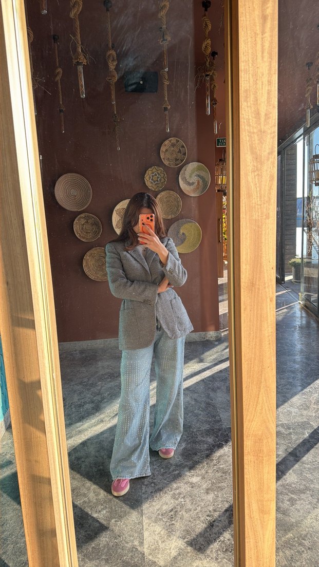 Gri vintage uzun kollu ve kesik yaka detaylı, günlük sokak stiline uygun rahat kadın blazer.