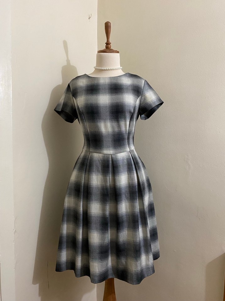 Gri renkli, kısa kollu vintage midi elbise, tekne yaka ve pileli etek detayına sahiptir. Yumuşak sentetik kumaştan, ofis için uygundur. İki yerinde ufak lekeler var. M bedendir. Alana hayırlı olsun. ✨