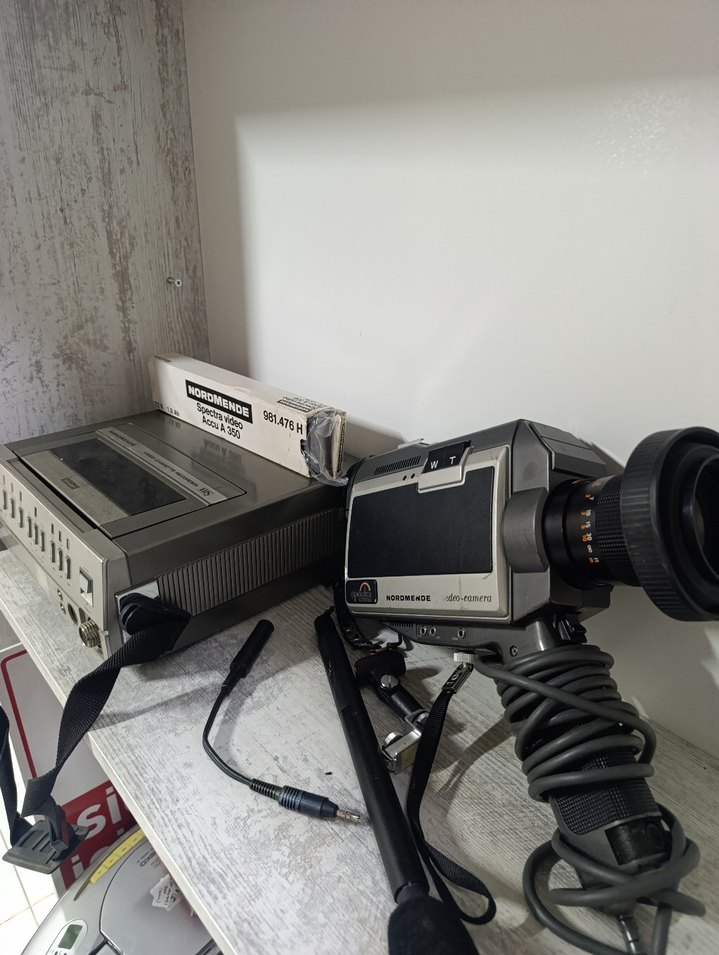 Gri renkli vintage video kamera ve yanında Nordmende marka ekipman,aktif çalışır durumdaKamera lensli ve kıvrımlı kabloya sahip. Ayaklığı mevcut.