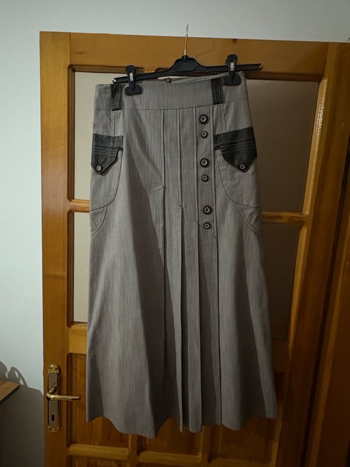 Gri renkli, keten kumaştan yapılmış, bol kesim ve pilili uzun etek. Düğme detayları ve cep süslemeleri bulunur. Vintage goth tarzında, ofis için uygundur. Boy 93 en 38/39
