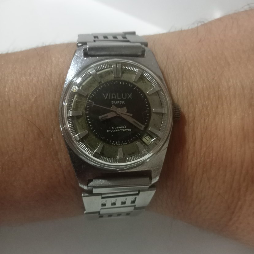 Gri kadranlı ve metal kayışlı vintage VIALUX erkek kol saati, 17 taşlı ve şok korumalı klasik tasarım sunar. ⌚