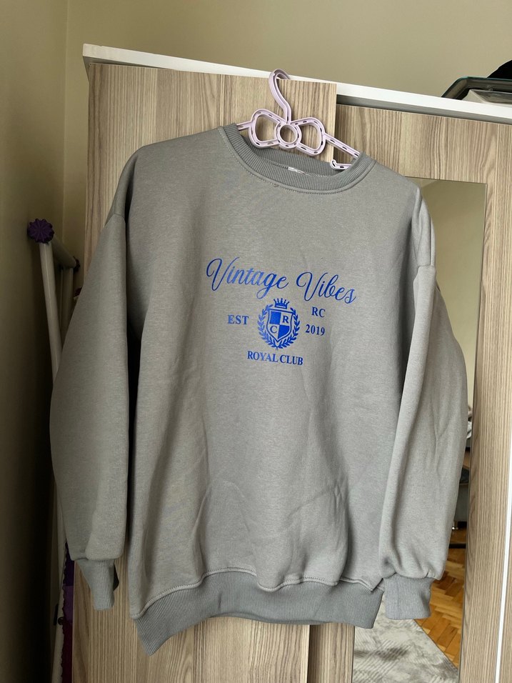 Gri renkli, uzun kollu, bisiklet yaka örme kumaştan sweatshirt. Vintage tarzı baskı ve bol kesimiyle rahat bir görünüm sunar. Baskıda EST 2019 ROYALCLUB yazısı bulunur. Kalın görselde içi de gösterildi yerin ürün sıfır