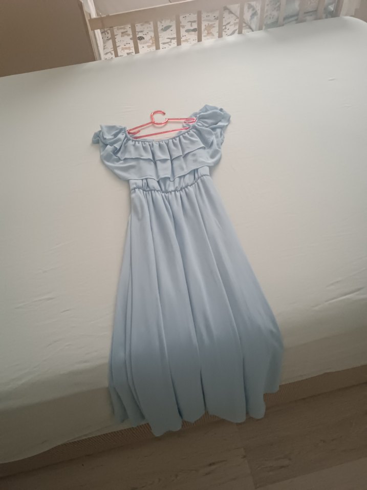 Gri renkte, volanlı straplez yakaya sahip, bol kesim uzun elbise. Bohem tarzıyla klasik şıklık sunar, düğünler için uygundur.